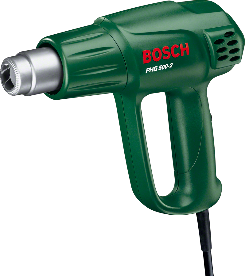 Το πιστόλι θερμού αέρα PHG 500-2 της Bosch είναι ένα εργαλείο γενικής χρήσης με 1.600 W ισχύ για την αφαίρεση μπογιάς ή βερνικιού και για την κασσιτεροκόλληση και τη στερέωση με διάφορα υλικά. Χάρη στη λειτουργία θερμοστόπ απενεργοποιούνται από μόνα τους τα θερμαντικά στοιχεία του πιστολιού θερμού αέρα σε περίπτωση υπερφόρτωσης. Η ροή του αέρα και η θερμοκρασία μπορούν να ρυθμιστούν σε δύο βαθμίδες. Μια βάση εναπόθεσης για τη χρήση ως σταθερό εργαλείο και μια κλειστή λαβή για ασφαλή εργασία καθιστούν το πιστόλι θερμού αέρα σε έναν πολύπλευρο βοηθό για τους ερασιτέχνες χρήστες. Επιπλέον η εύχρηστη συσκευή θερμού αέρα έχει συμπαγή κατασκευή και ζυγίζει μόνο 0,75 κιλά.