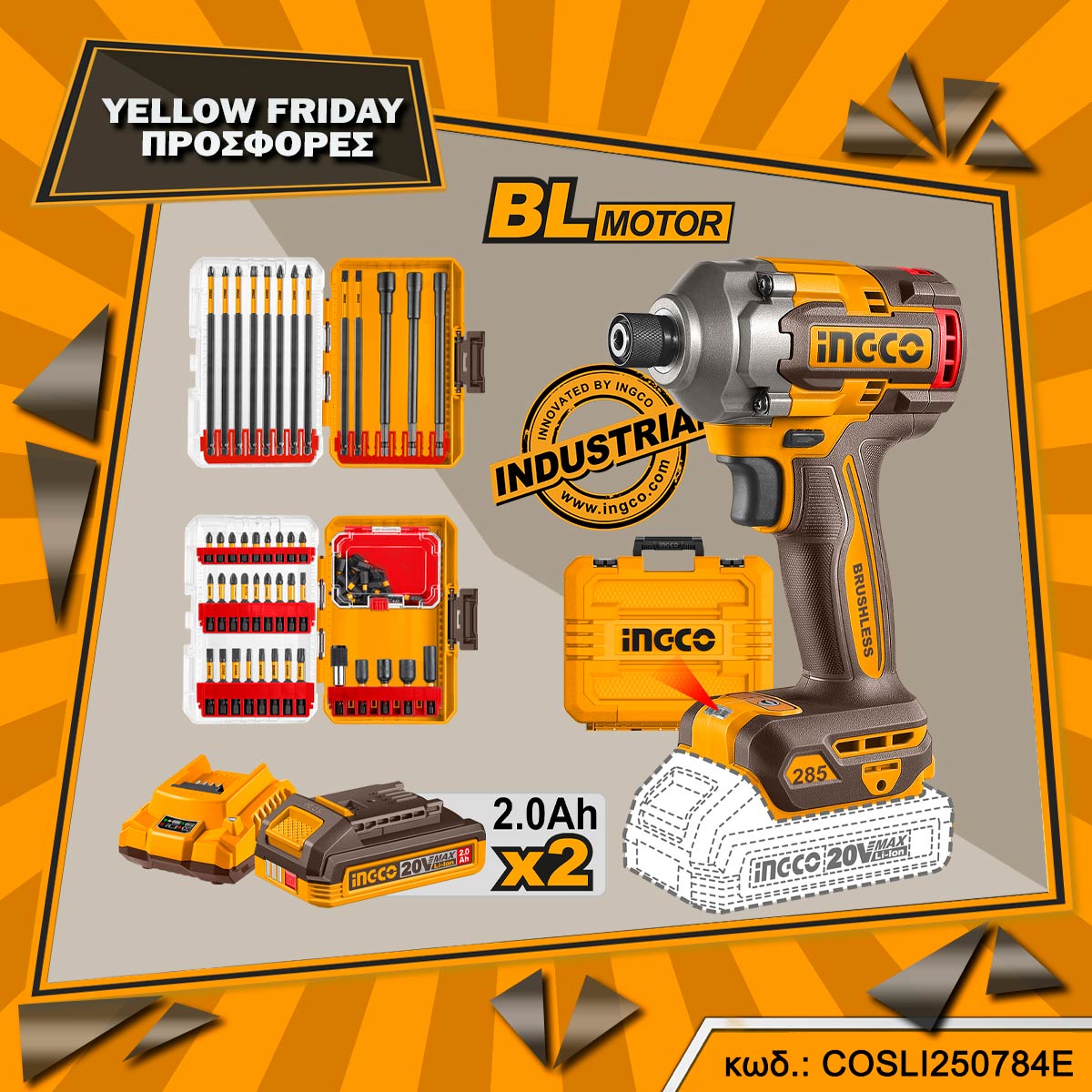 Κατσαβίδι Παλμικό Μπαταρίας 20V Li-Ion 285Nm + 2 Σετ Μύτες Impact Ingco COSLI250784E
