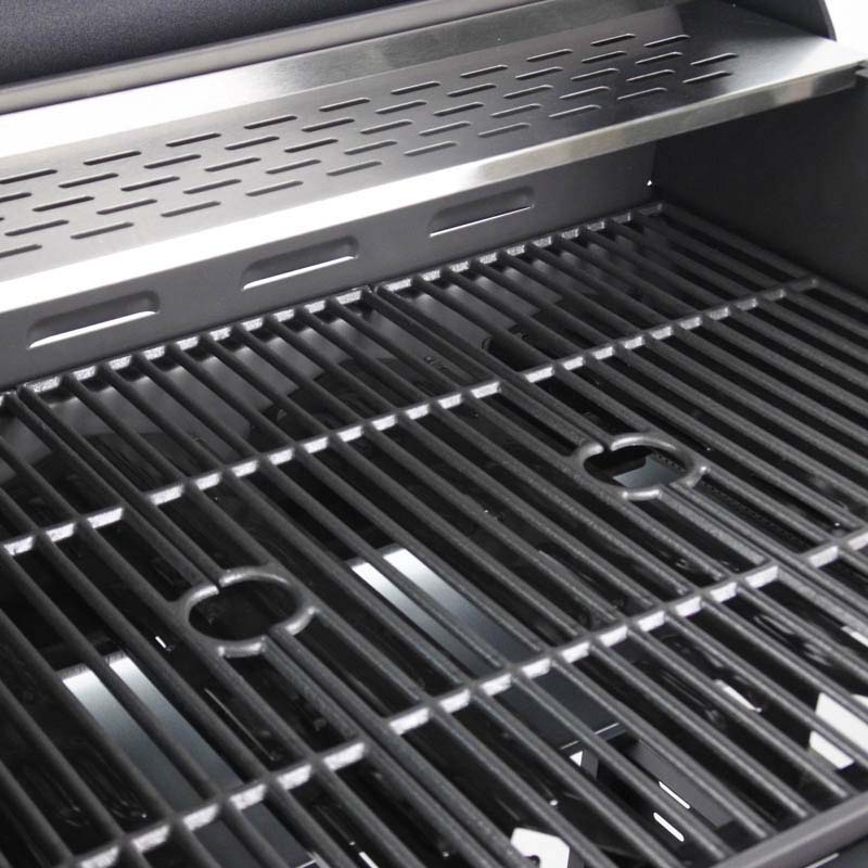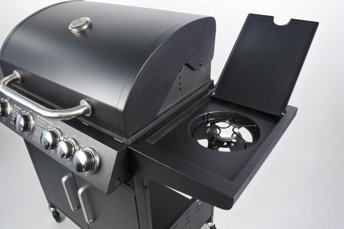 Ψησταριά Υγραερίου ELEMENT 4+1 εστιών απο τη BORMANN, με μαντεμένια σχάρα, ρόδες για εύκολη μεταφορά και μεγάλο θερμόμετρο στο καπάκι. Επίσης διαθέτει 2 ράφια στις πλευρές και πιεζοηλεκτρικό άναμμα εστιών.