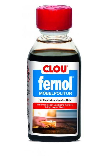 Το καθαριστικό και γυαλιστικό FERNOL MÖBELPOLITUR της CLOU καθαρίζει, φρεσκάρει και γυαλίζει όλα τα βερνικωμένα έπιπλα. Καθαρίζει σε βάθος, εξαφανίζοντας σκόνη, βρωμιά και λεκέδες από νερό ή οινόπνευμα. Απομακρύνει σημάδια και γρατζουνιές, αδιαβροχοποιώντας και δίνοντας γυαλάδα.